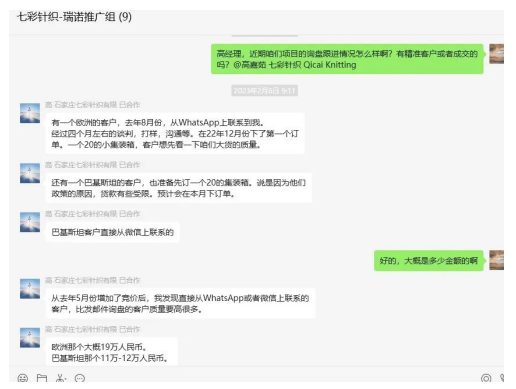 有一次,七彩針織打算推出一項重點產品,高經理在瑞諾推廣對接群里說出自己的需求。第二天,網站內容便隨之改變,再過幾天,接二連三的詢盤如期而至。在其中,有個特別有誠意的客戶,想要在加拿大推廣產品,甚至想要自付海運費。這種主動承擔運費的客戶,對于七彩針織來說非常珍貴,他們當即決定免費寄給客戶。
